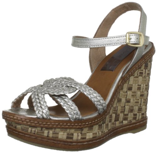 A fashionable wedged platform sandal, and in silver or black braided leather.